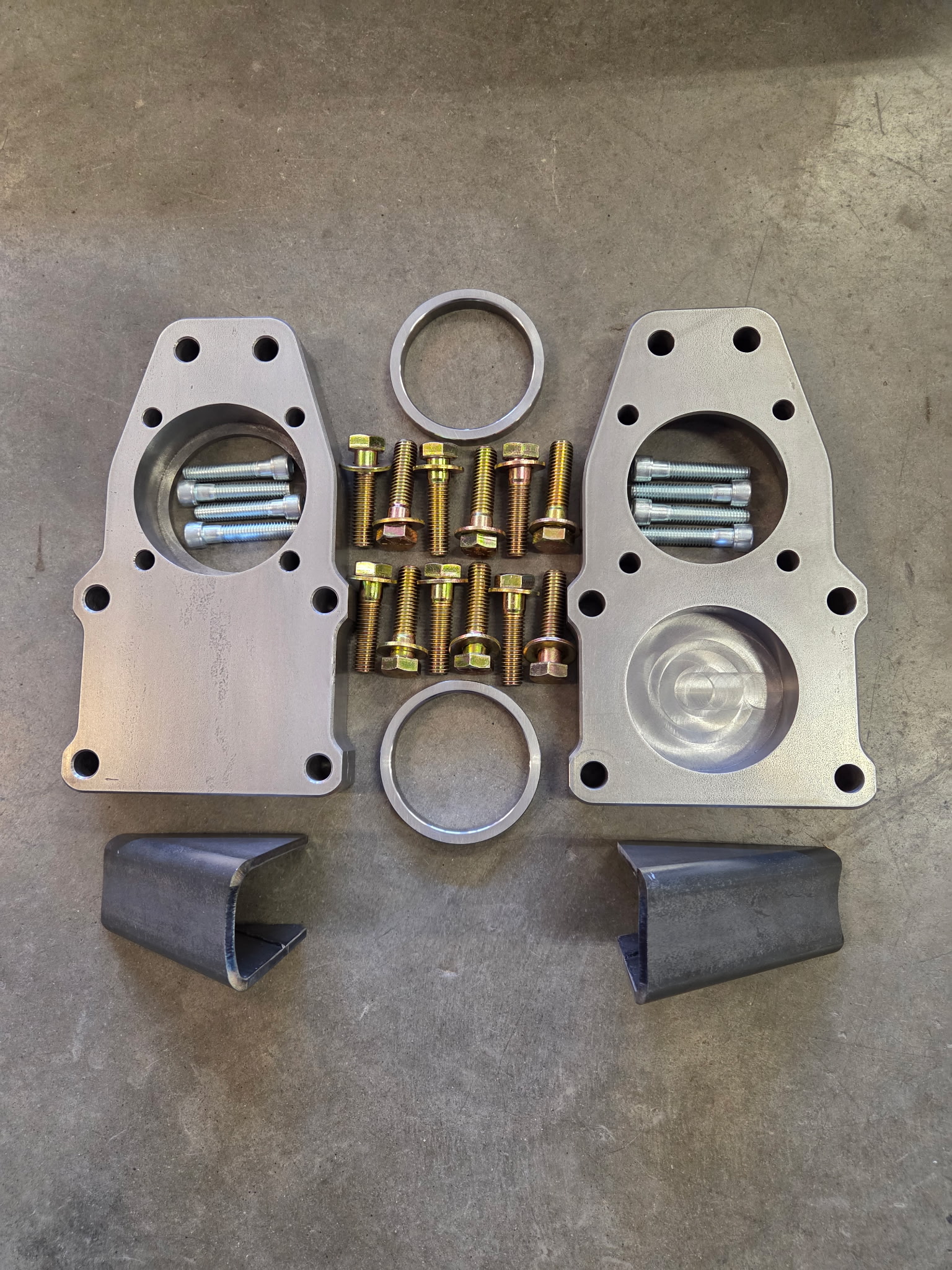 Our HMMWV rear adapters allow you to modify a standard HMMWV portal case to be used on a non-steer rear axle. The upper ear of the case will need to be cut off flush with the mounting surface, and two additional 1/2″ – 13 holes will need to be tapped. Adapters are machined to fit 3.5″ OD axle tubes. Includes 3/16″ thick gusset.